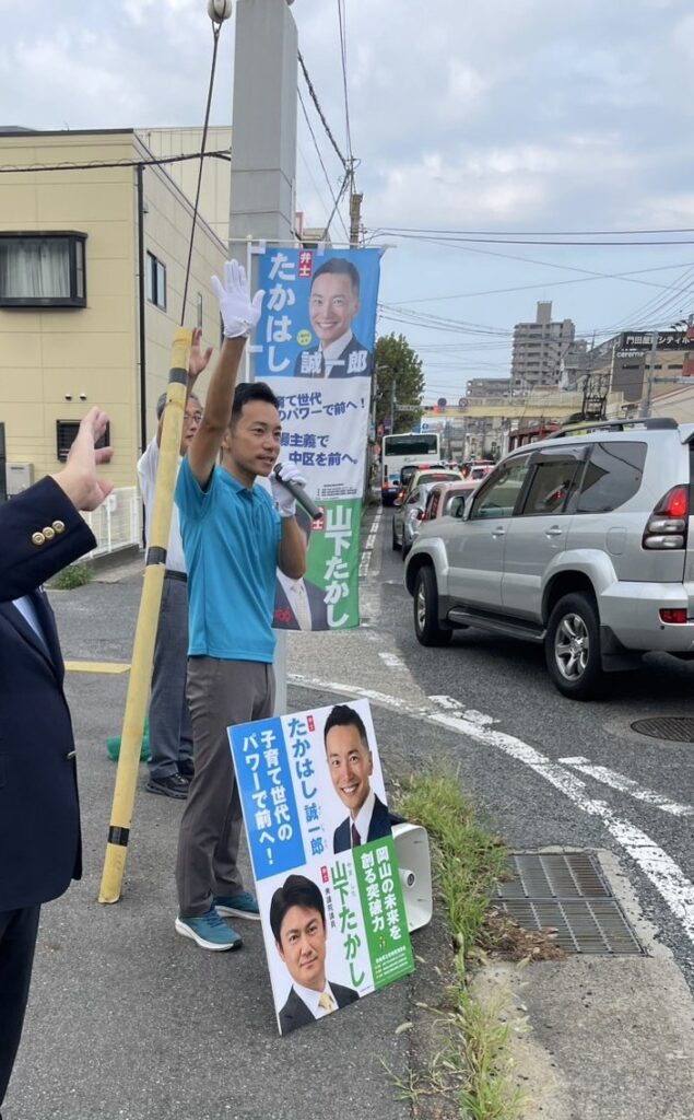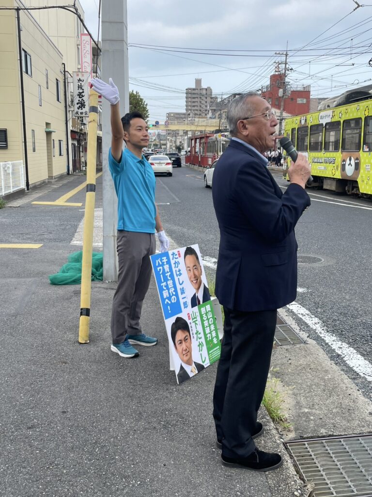 お疲れ様です!今朝は #東山電停 で小倉県議、三木市議と一緒に街頭演説をしました。