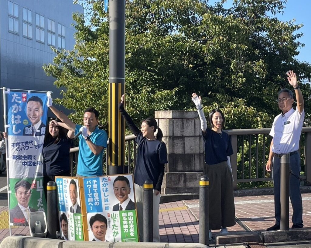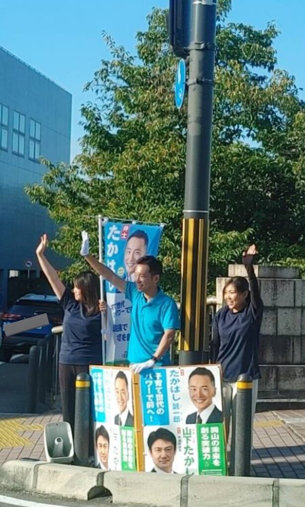 小倉県議の力強い言葉に励まされながら自分の施策を訴えました。今日は #岡山政経塾 の仲間が駆けつけてくれました
